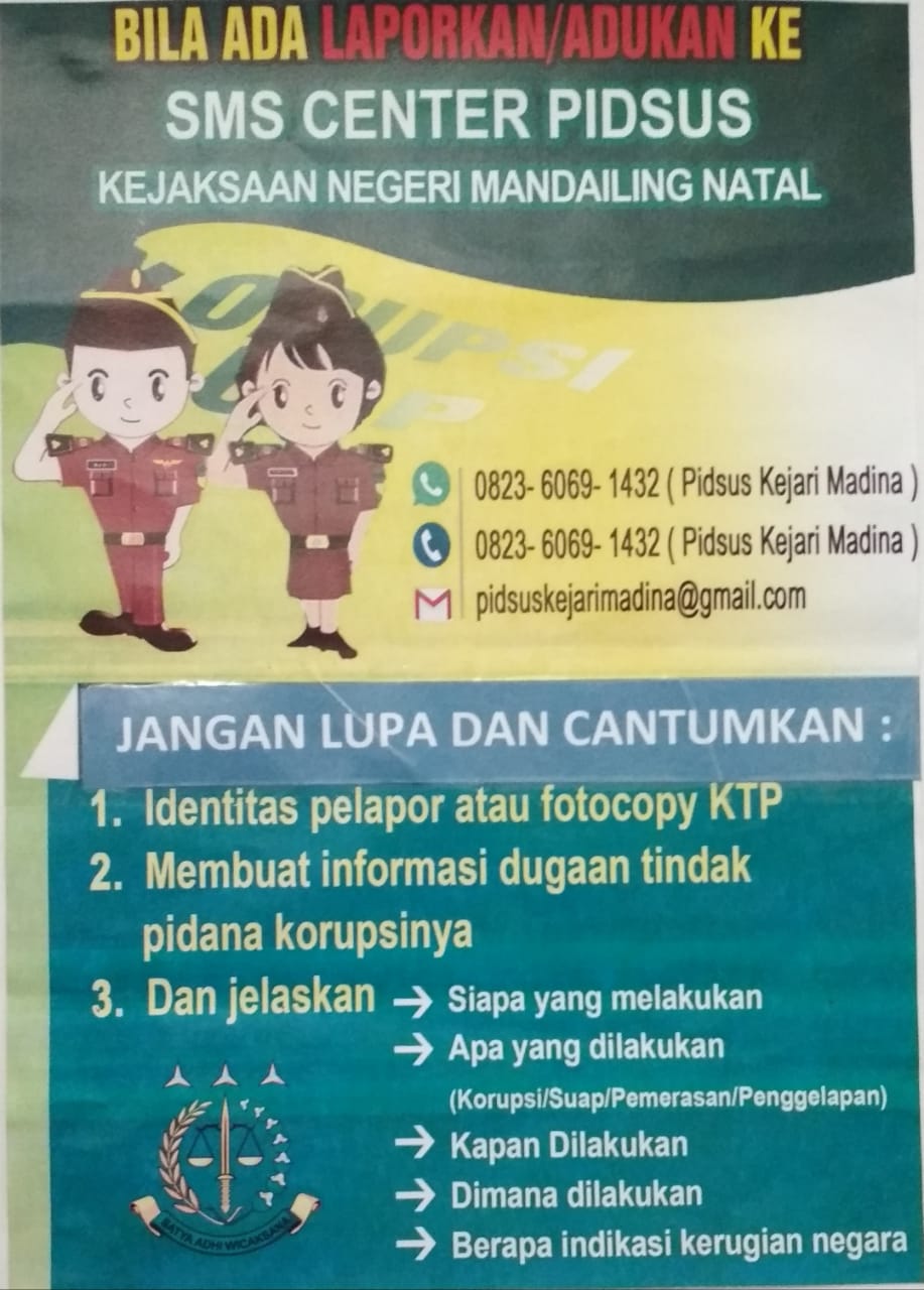 Diskominfo – Madina. Dalam rangka mencegah dan memberantas Tindak Pidana Korupsi, Kejari Mandailing Natal membagikan brosur pengaduan masyarakat melalui sms center pidsus Kejaksaan Negeri Mandailing Natal.