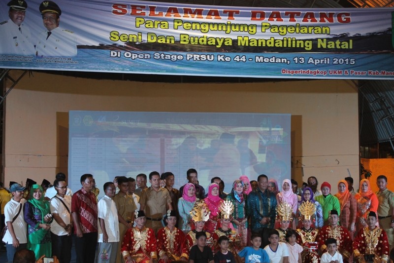 Bupati Madina Hadiri Pagelaran Seni Budaya PRSUPanyabungan 14/4 – Bupati Madina Drs. H. Dahlan Hasan Nst didampingi Istri Ny. Ika Desika Dahlan Hasan menghadiri Pagelaran Seni dan Budaya Mandailing Natal pada open stage PRSU Ke-44 tahun 2015 di Medan Sumatera Utara, Senin.