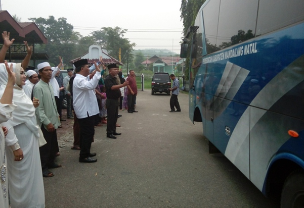Panyabungan 11/10 – Bupati Madina Dahlan Hasan didampingi Ketua TP-PKK Madina Ny Ika Desika Dahlan Hasan, Sekda M Syafei Lubis bersama Ulama dan Kakan Kemenag Madina melepas 24 pelajar tingkat Madrasah Diniyah se Kabupaten Mandailing Natal untuk mengikuti kegiatan Porsadin, Minggu.