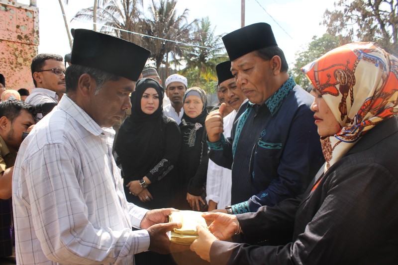 Panyabungan 9/6 – Bupati Madina Drs. H. Dahlan Hasan Nst didampingi Ketua TP-PKK Madina Ny. Ika Desika Dahlan Hasan Bersama Ketua DPRD Hj. Lely Hartati Sag beserta unsur Muspida dan Pimpinan SKPD menyerahkan bantuan dana pembangunan rumah korban kebakaran Desa Ujungmarisi Kec. Kotanopan Kab. Madina, Selasa.