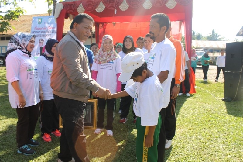 Panyabungan, Sumut 26/4 – Usai melaksanakan senam massal, Bupati Mandailing Natal Drs. H. Dahlan Hasan Nst bersama Ketua TP-PKK Madina Ny. Ika Desika Dahlan Hasan secara simbolis menyerahkan kartu BPJS PBI APBD Kab. Madina Tahun 2015 di lapangan Kantor Bupati Lama Panyabungan, Minggu.