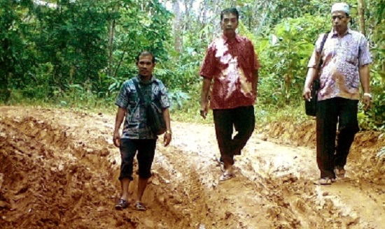 Jalan kaki pulang pergi itu melewati jalanan jenis tanah liat berlumpur. Kondisi ini akibat belum adanya jalan aspal menuju desa itu.