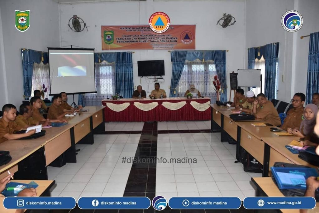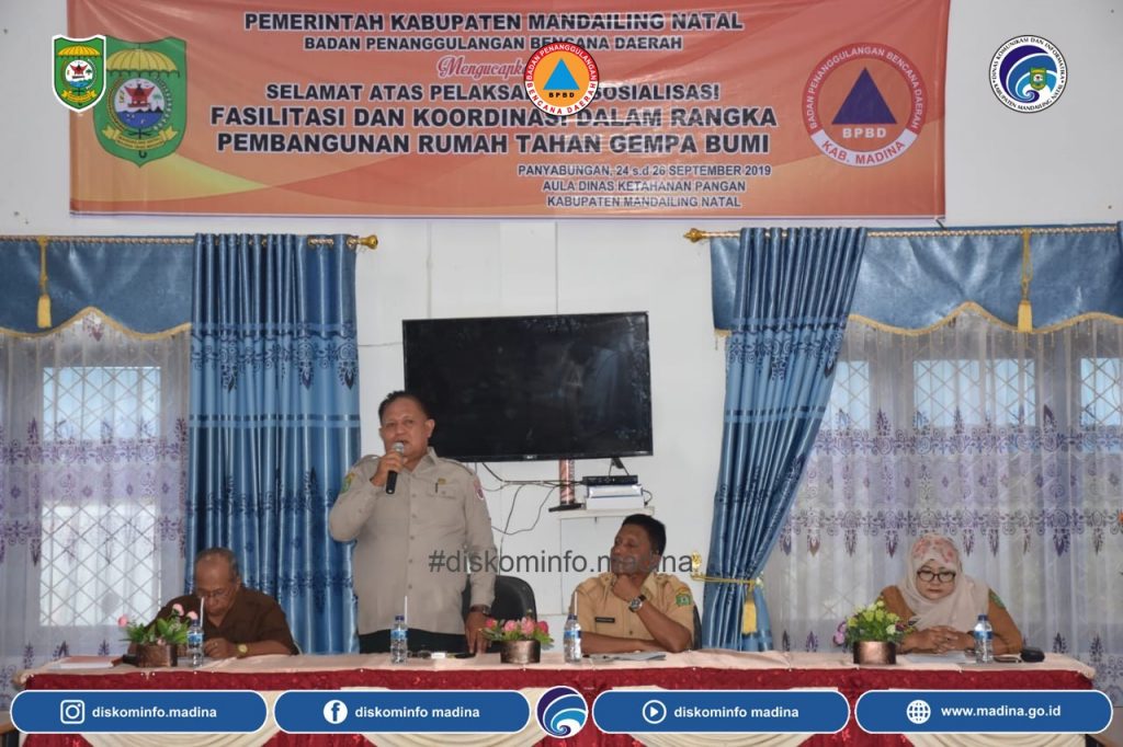 BPBD Kabupaten Mandailing Natal dalam melaksanakan kegiatan sosialisasi fasilitasi dan koordinasi pembangunan rumah tahan gempa di Kabupaten Mandailing Natal mulai tanggal 24-22-26 september 2019 sebanyak 60 orang peserta dari perwakilan aparatur pemerintahan, perusahaan swasta dan juga masyarakat serta bidang pembangunan fisik yang nantinya menjadi rekan pemerintah dalam membangun rehabilitasi perencanaan pendirian rumah tahan gempa di Kabupaten Mandailing Natal.