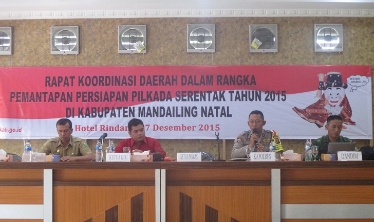 Hal itu disampaikan Gunawan Hery saat menyampaikan kesiapan satuannya sebagai petugas kemanan dan ketertiban menjelang Pemilihan Bupati dan Wakil Bupati Madina tahun 2015 dalam Rapat Koordinasi Daerah (Rakorda) yang berlangsung di Aula Utama Hotel Rindang Panyabungan, Senin (7/12).