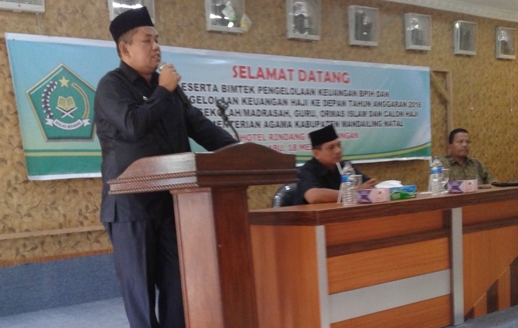 Kepala Kantor Kementerian Agama Kabupaten Mandailing Natal Drs.H.Muksin Batubara.M.Pd mengatakan kegiatan bimtek ini dilakukan bertujuan untuk terwujudnya pengetahuan dan pemahaman yang sama tentang bagaimana pengelolaan keuangan BPIH tahun 2016 dan untuk menyampaikan informasi pengeloaan keuangan haji dan prospek keuangan haji kedepan kepada pengelola pendidikan,ormas islam dan calon haji.