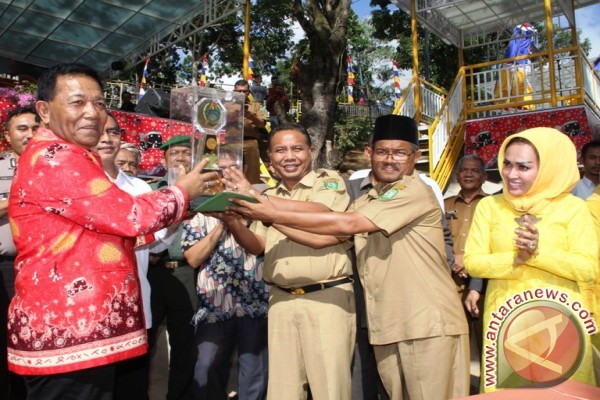 Bupati Mandailing Natal, Drs.H.Dahlan Hasan Nasution bersama dengan Plt.Sekda, Drs.M.Syafeii Lubis dan Kadis PMD, Gozali Pulungan saat mengangkat tropi TTG di Taman Raja Batu, Panyabungan. ((Antarasumut/Holik))