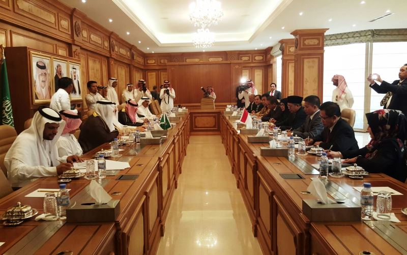 Jeddah – Menteri Agama Lukman Hakim Saifuddin mengadakan pertemuan dengan Menteri Urusan Haji Kerajaan Saudi Arabia Bandar Bin Muhammad Hajjar, Minggu (13/03) guna membahas dan merumuskan MoU persiapan pelaksanaan haji. Keputusan dari pertemuan ini akan menjadi pedoman bagi Pemerintah Indonesia dalam menyusun Biaya Penyelenggaraan Ibadah Haji (BPIH) tahun ini.