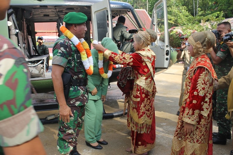 Kedatangan Pangdam I/BB Mayjen TNI Edy Rahmayadi bersama Istri yang menggunakan Helikopter milik TNI-AD disambut para pelajar dengan mengenakan pakaian Adat Mandailing Natal serta memberikan kalung Bunga di lapangan SD Negeri 127 Pagur Kec. Panyabungan Timur Kab. Madina.