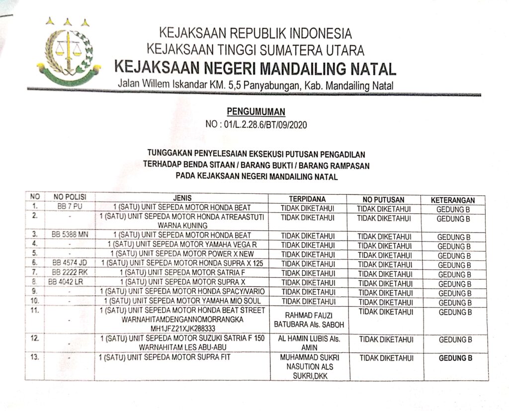 Berdasarkan surat Kepala Kejaksaan Negeri Kabupaten Mandailing Natal Nomor : B-776/L.2.28/Cu.3/09/2020 Tanggal 30 September 2020. Bersama ini kami umumkan daftar barang bukti yang belum diambil pemiliknya atau barang rampasan yang berkas dan putusannya sudah tidak ditemukan lagi, sebagaimana terlampir dibawah ini :