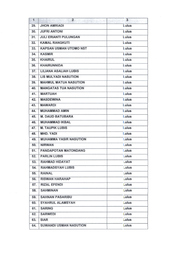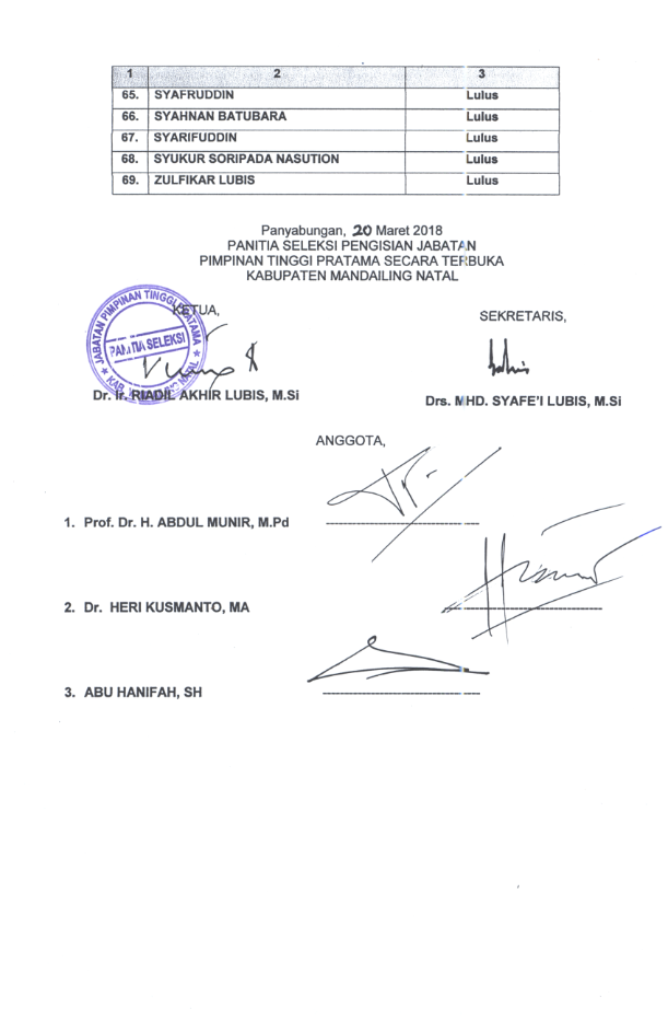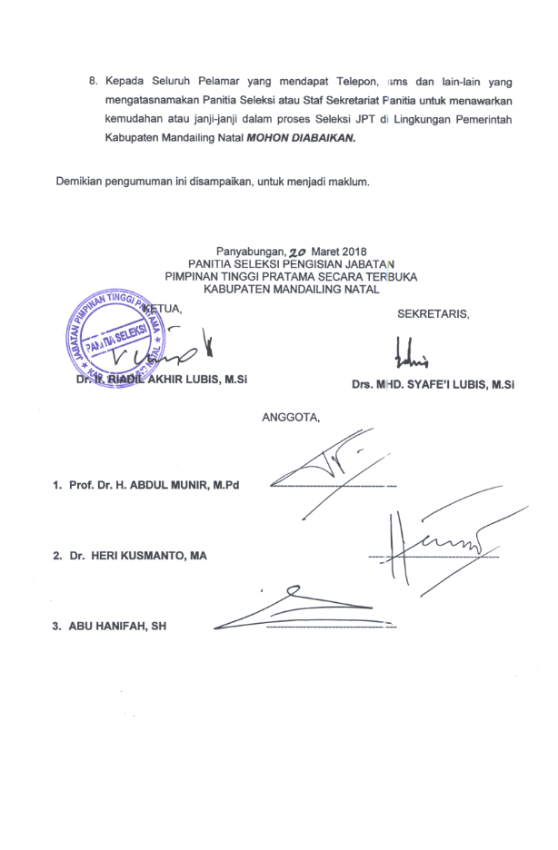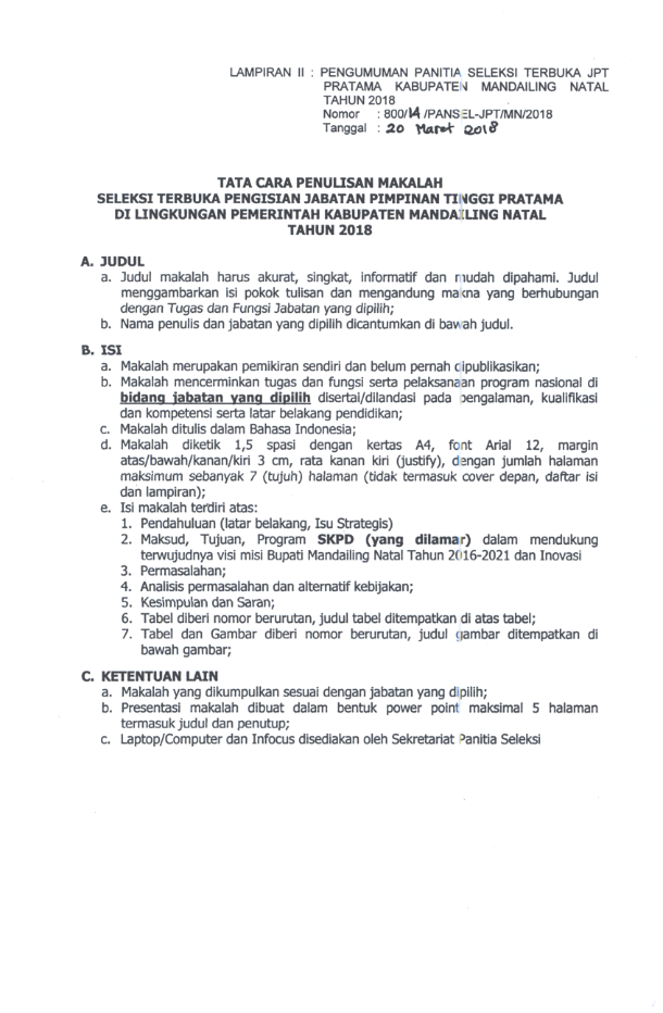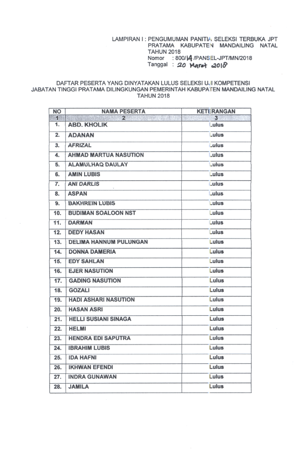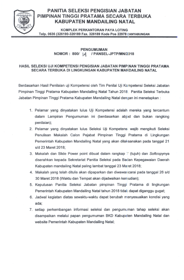 PENGUMUMAN HASIL SELEKSI UJI KOMPETENSI PENGISIAN JABATAN PIMPINAN TINGGI PRATAMA SECARA TERBUKA DI LINGKUNGAN KABUPATEN MANDAILING NATAL