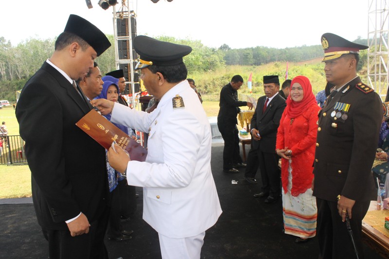 Panyabungan 17/8 – Bupati Madina Drs. H. Dahlan Hasan Nst didampingi Ketua DPRD Madina Hj. Lely Hartati Sag, Ketua Pengadilan Negeri Panyabungan Halomoan Sianturi dan Kapolres Madina AKBP Adry Setiawan menyerahkan sekaligus menyematkan Satya Lencana Pengabdian 10 Tahun.