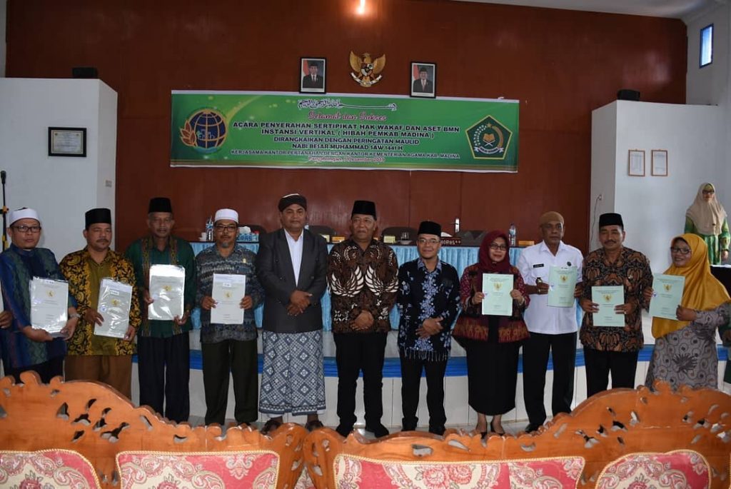 Diskominfo – Madina. Bupati Mandailing Natal, Drs. H. Dahlan Hasan Nasution menghadiri acara Penyerahan Sertifikat Hak Wakaf dan Aset BMN Instansi Vertikal (Hibah Pemkab Madina) Dirangkai dengan Peringatan Maulid Nabi Besar Muhammad SAW 1441 H yang dilaksanakan oleh kerjasama dari Kantor Pertanahan dengan Kementerian Agama Kab. Mandailing Natal, acara ini berlangsung di Kantor Kementerian Agama Kab. Mandailing Natal. Kamis, 5/12/2019.