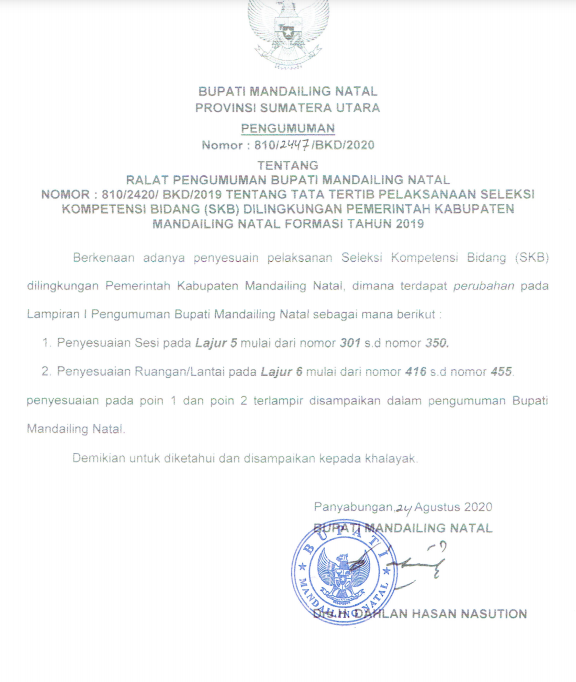 Berkenaan adanya penyesuaian pelaksanaan Seleksi Kompetensi Bidang (SKB) dilingkungan Pemerintah Kabupaten Mandailing Natal, dimana terdapat perubahan pada Lampiran I Pengumuman Bupati Mandailing Natal sebagaimana berikut :