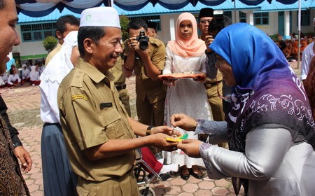 Ketua Tim Penggerak PKK Sumut menyerahkan kunci kepada Kepala Sekolah SLB Panyabungan Ali Yusrat, S.Pd, dan Ketua Tim Penggerak PKK Madina memberikan bantuan Tas kepada Siswa/i SLB.